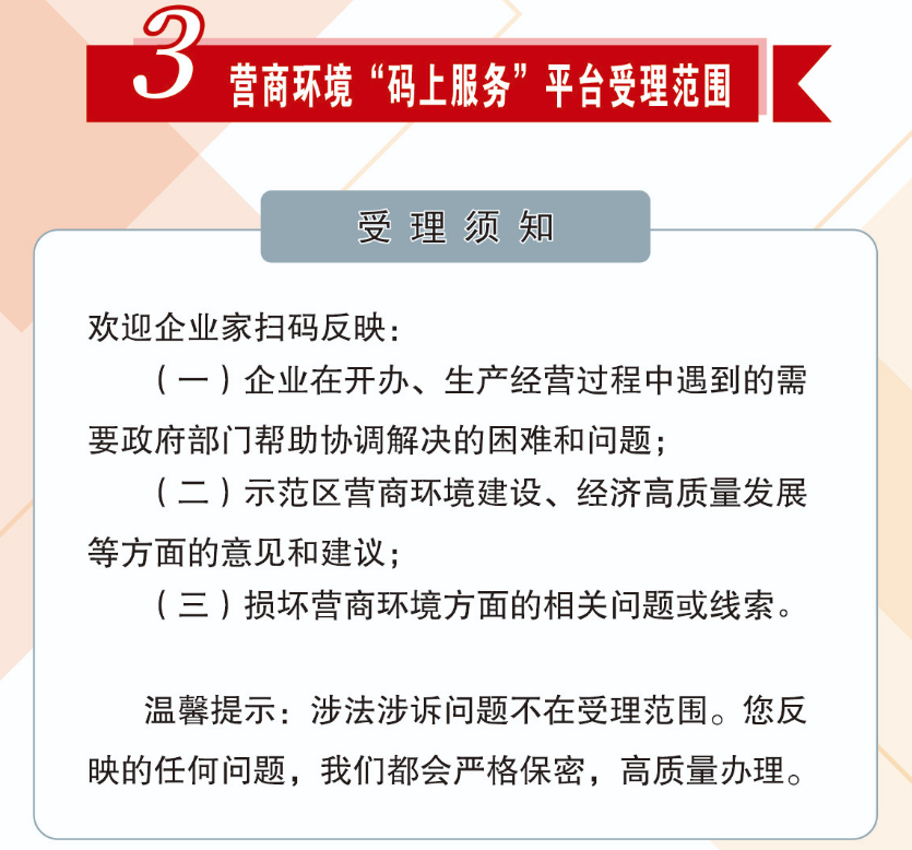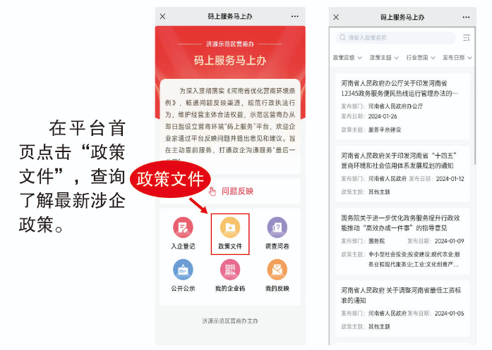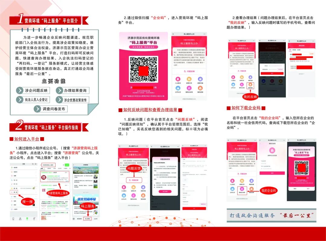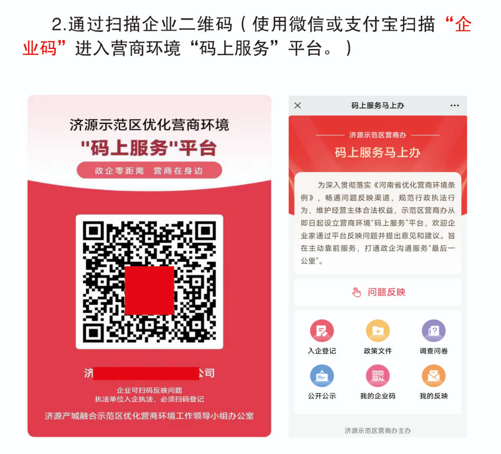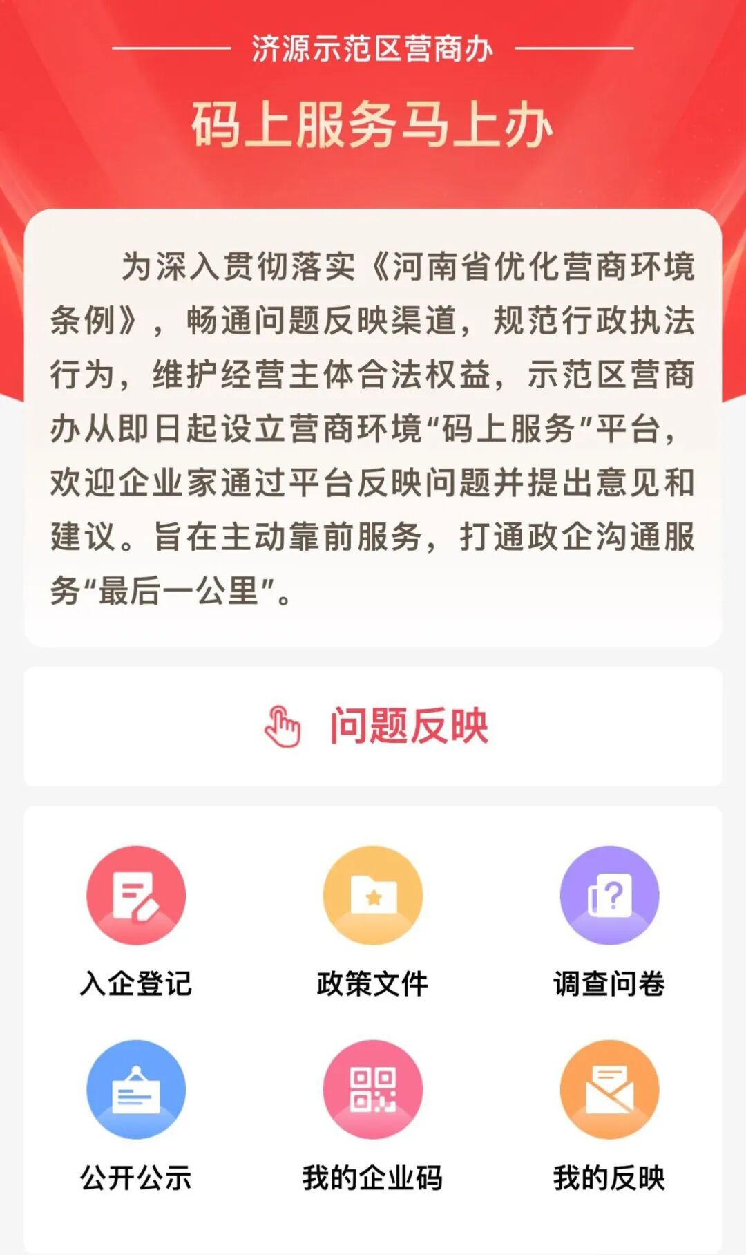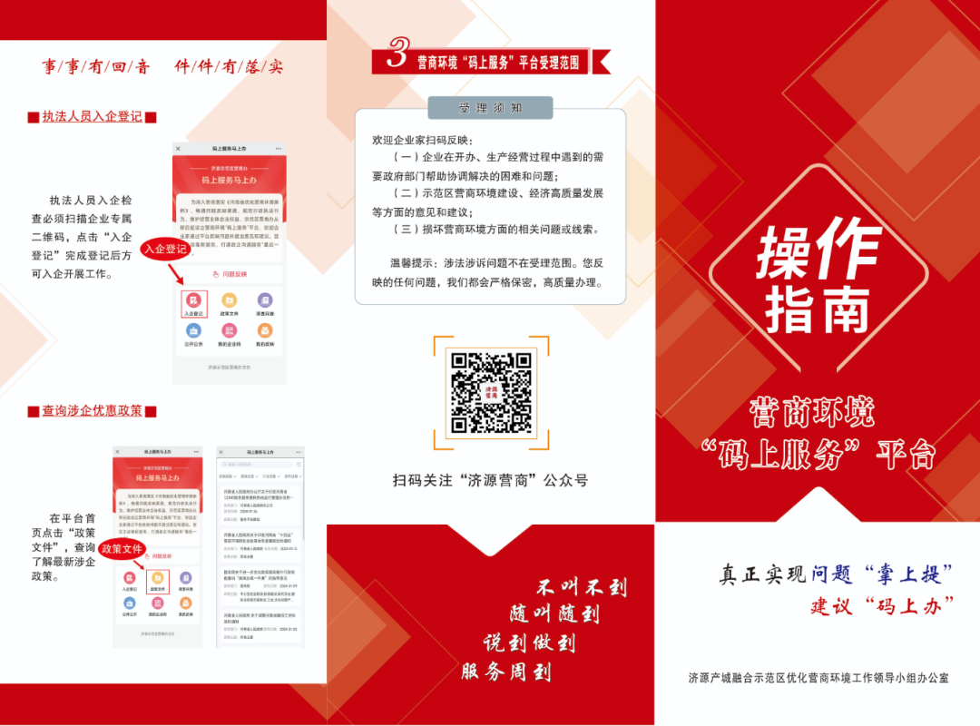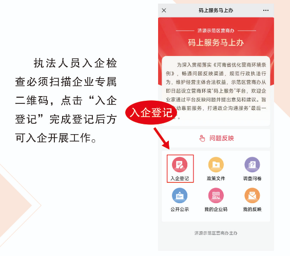 好的营商环境,就像阳光、水和空气,为市场主体提供充沛的营养、生长的沃土。为进一步优化营商环境,济源示范区开通了营商环境“码上服务”平台,畅通企业反映问题渠道、规范职能部门入企执法行为。