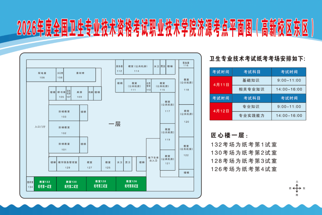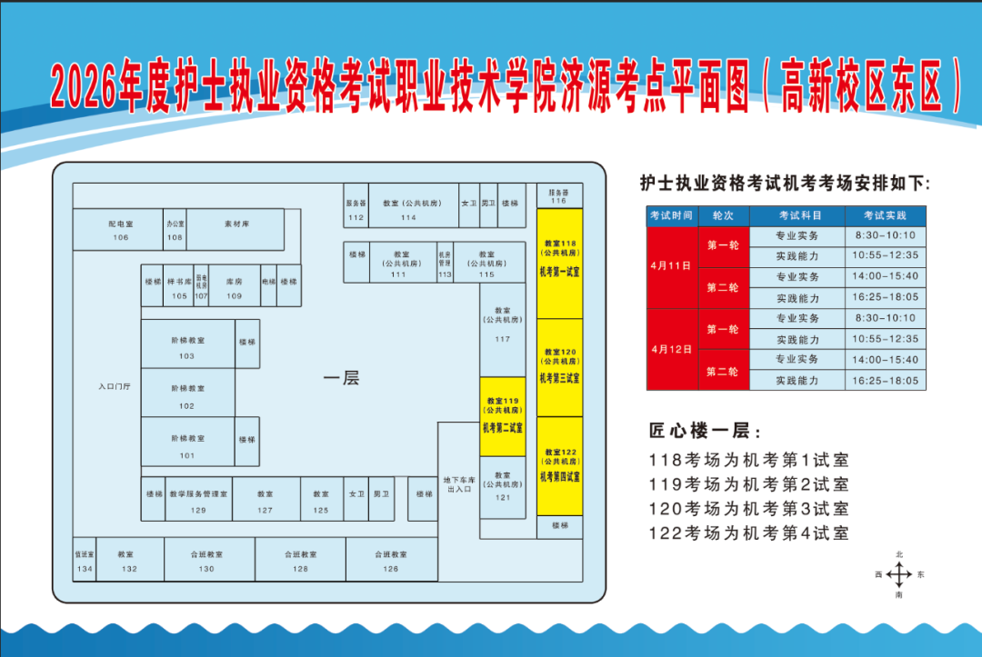护士执业资格考试、卫生专业技术资格考试(纸考)考生统一从济源职业技术学院高新校区(东区)北大门(地址:济源示范区黄河大道东段677号)进入,按指引标识直达匠心楼考场。
