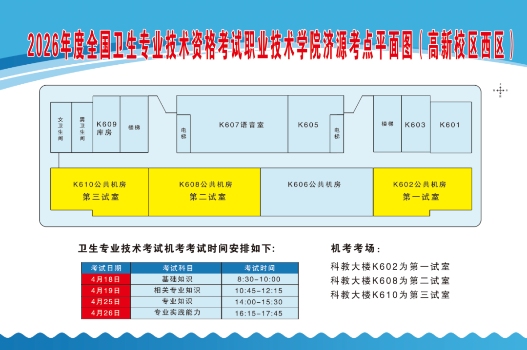 卫生专业技术资格考试(人机对话)考生统一从济源职业技术学院高新校区(西区)北大门(地址:济源示范区黄河大道东段677号)进入,按指引标识直达科教大楼考场。