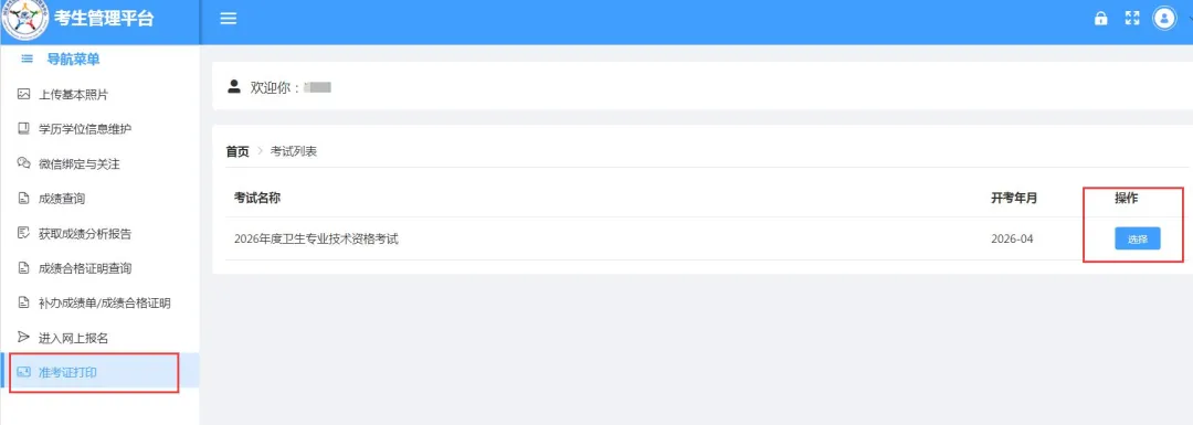 登录考生管理平台后,点击左侧导航栏“准考证打印”,在考试列表中选择考试项目。