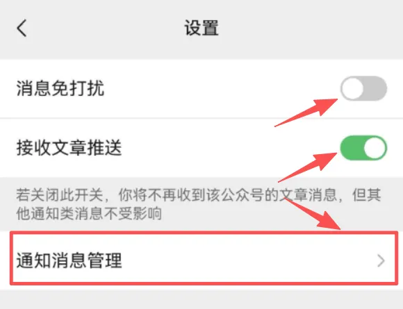 3.关闭“消息免打扰”,开启“接收文章推送”